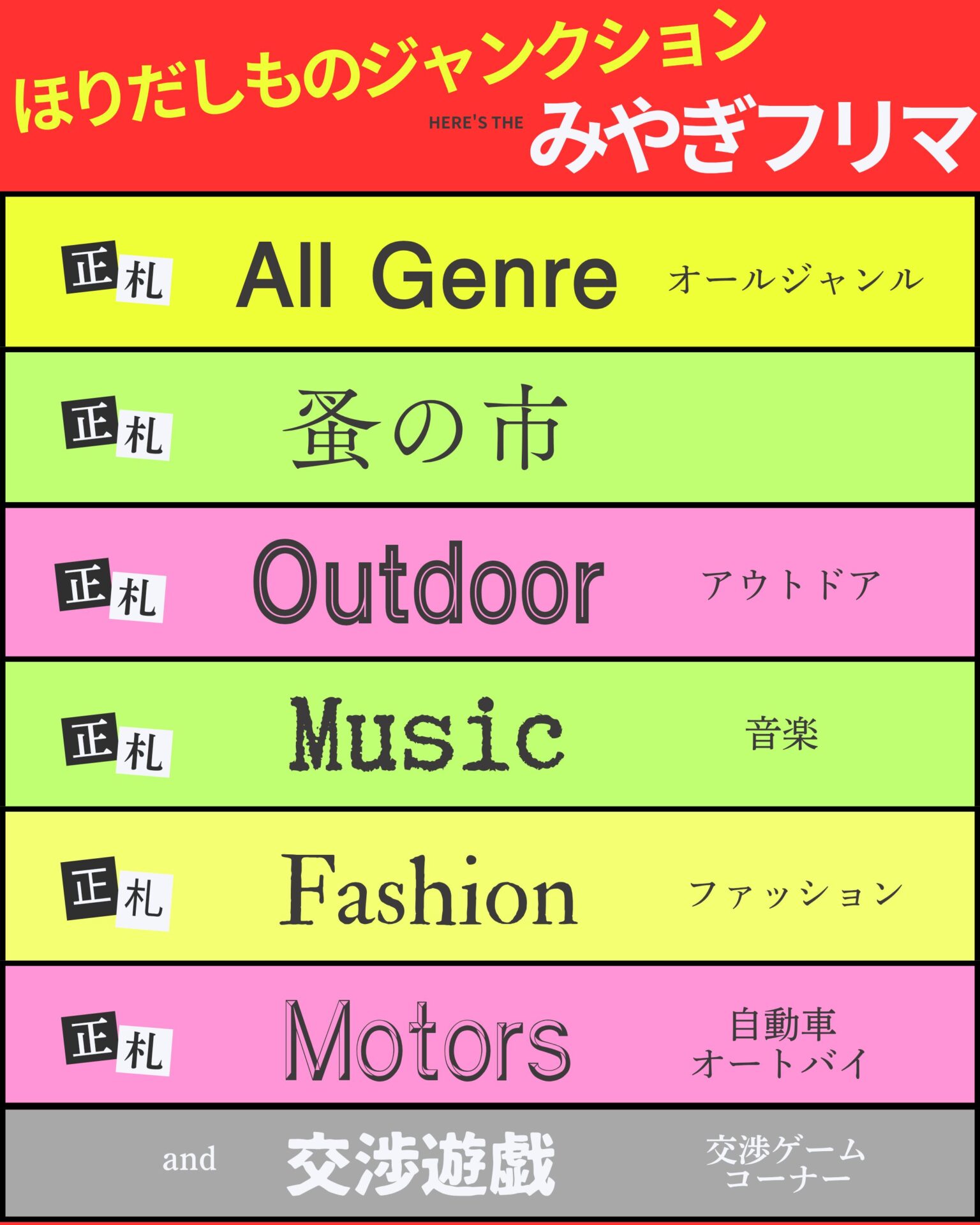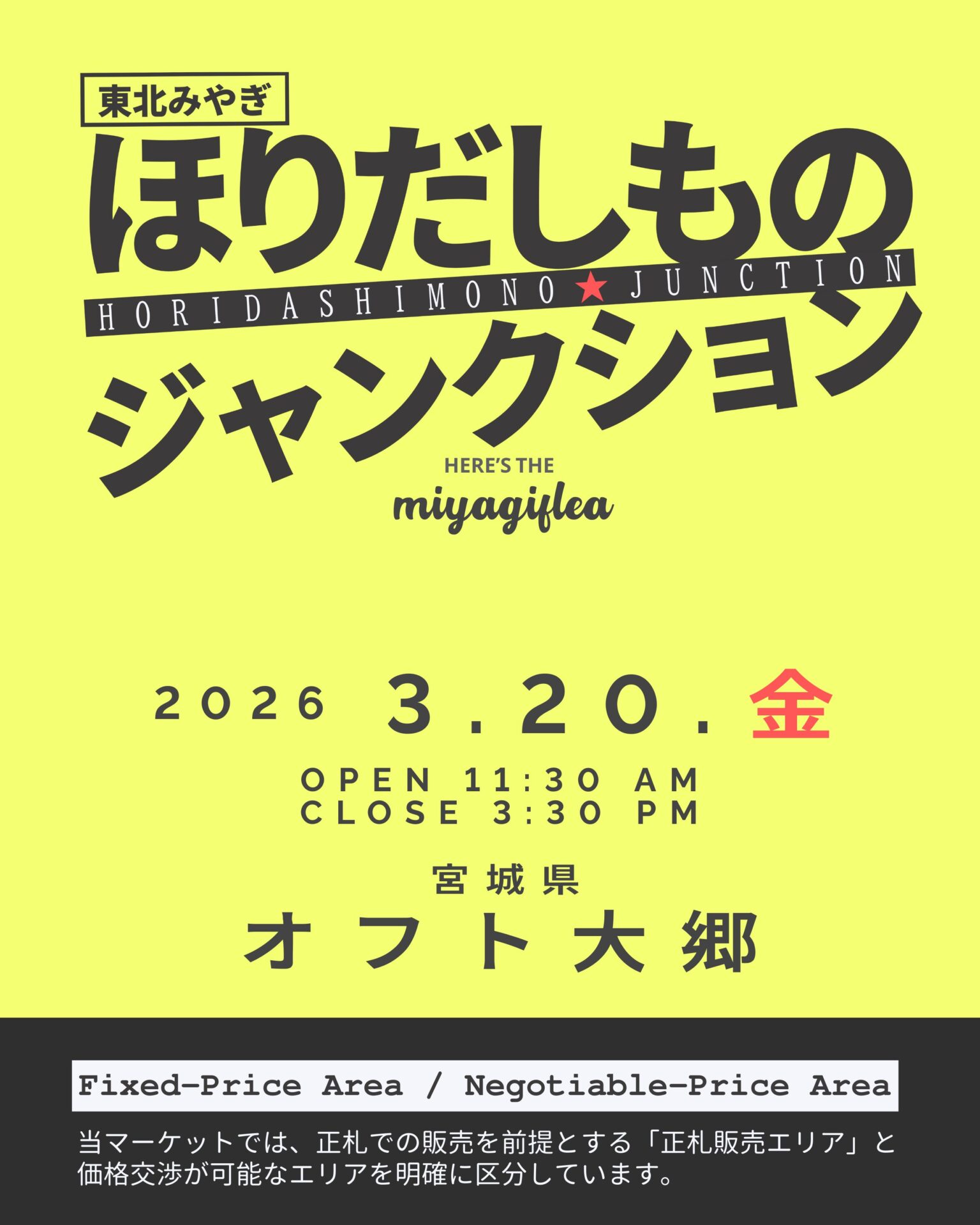 2.正札販売エリアでの価格交渉は一切禁止です。みやぎフリマでは、「価格交渉こそがフリーマーケットの醍醐味である」という考え方を採用しておりません。正札エリアは表示価格での販売を前提としたエリアです。ルールをご理解のうえご参加ください。